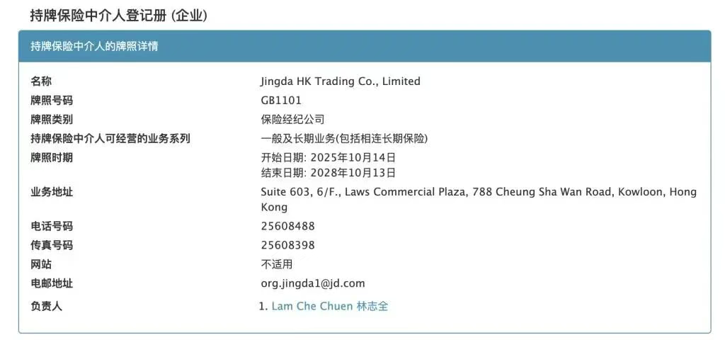 据相关消息,10月中旬,香港保监局持牌保险中介人登记册显示,京东旗下Jingda HK Trading Co., Limited 于10月14日已取得保险经纪公司牌照,随后,该公司更名为“京东保险顾问(香港)有限公司”。